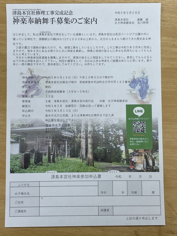 地元の北方小学校では毎年子供神楽を学ぶ授業があり、子供神楽の伝統がありますので、今回の例祭日に神楽を奉納していただける児童の募集をはじめました。沢山集まればいいなと思います。