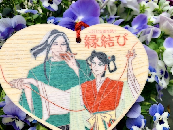 師匠や先生方の下見稽古で初参拝をさせていただいた時に、師匠が宮司様にご紹介を下さりまして…… 例祭当日にサンプルとなる御影アイテムをどっさり持参し、御霊神社様に「何かございましたら!」と納めさせていただいた事がきっかけとなり、ご依頼をいただいたのが「良縁絵馬」の企画デザインでした。