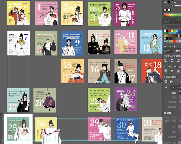 一旦、全てのデザインベースを並べてから、色味や言葉の調整や、デザインの細かな部分の更新をして全体のトーンを揃え、入稿に入ります。