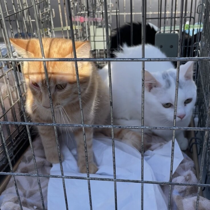 白猫の女の子と茶トラ猫の男の子は一緒にキャリーケースの中にいて、 とても仲良しでしたが、最初は一人だけ譲渡していただこうと思っておりました。しかし、引き離すのはかわいそうかな…と思い、二人を譲渡していただきました。