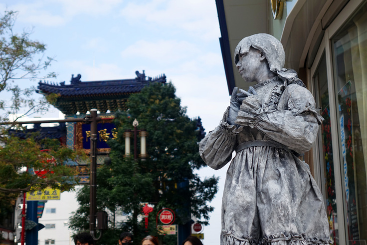 ・スタチューパフォーマンスは、街並みに調和してその魅力をさらに高めることができるのが特徴であり、街と博物館とパフォーマー、三者のコラボレーションが期待できるものです。横浜ユーラシア文化館が位置する横浜のセントラルタウン地区は、横浜を代表する観光地である山下公園や横浜中華街・元町商店街の近くに立地しています。この地域には歴史的な建造物や「○○発祥の地」のような場所がたくさんあり、いわば街全体が博物館ともいえる地域です。スタチューパフォーマンスを楽しみながら街を歩くことで、自然に歴史的なスポットを巡り、横浜の歴史や文化にも触れていただきたいと考えています。