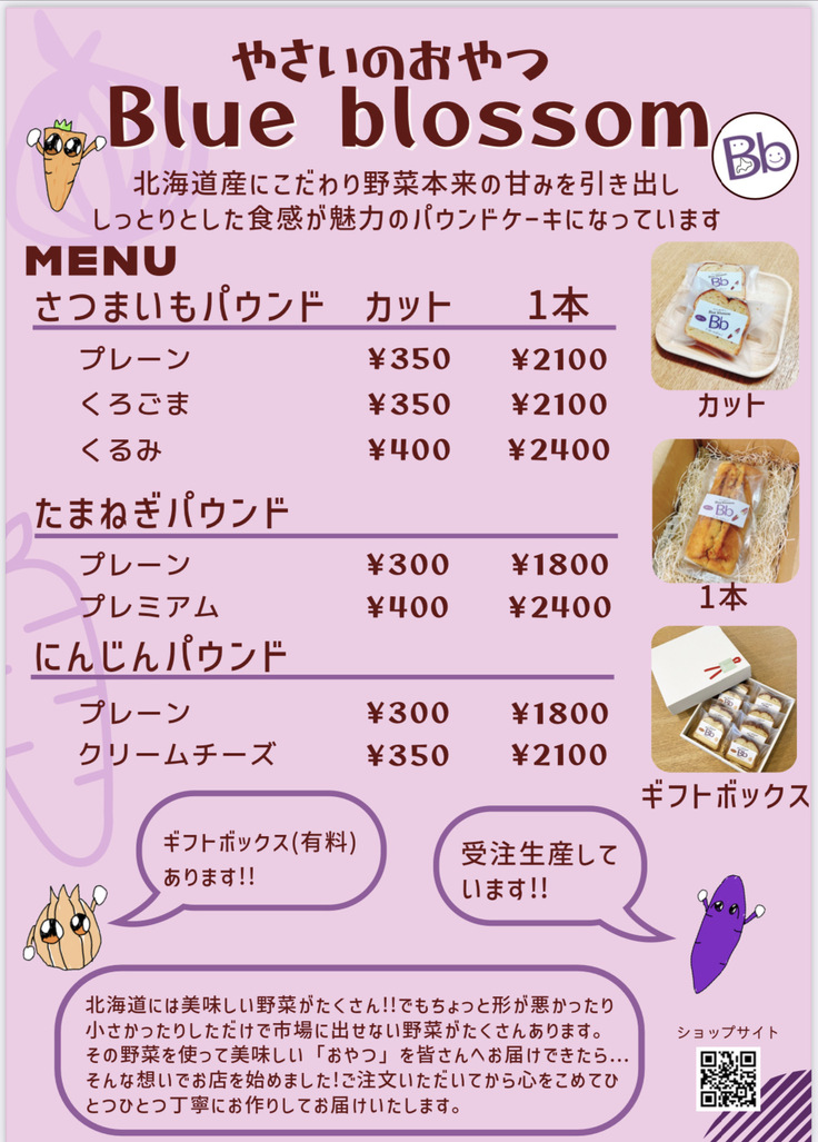 やさいのおやつ ブルーブロッサム 北海道産の野菜をたくさん使ったおやつをお届けしています。 発達障害のある娘の稼げる手段のひとつとして家族経営でお店を始めました。
