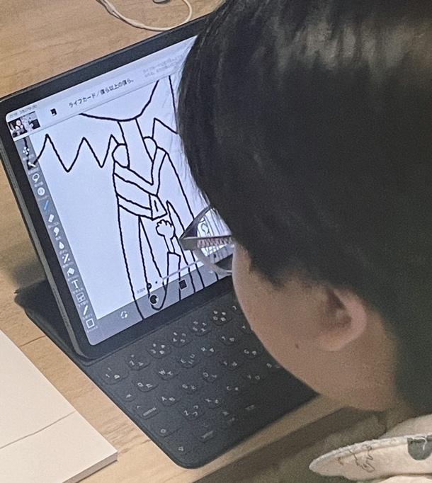 写真は娘がiPadでオリジナルキャラクターの絵を描いている姿です。