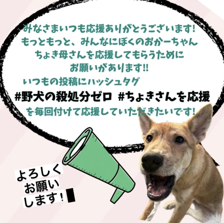 拡散協力のお願い!#野犬の殺処分ゼロに #ちょきさんを応援 の2つをつけて応援投稿してください