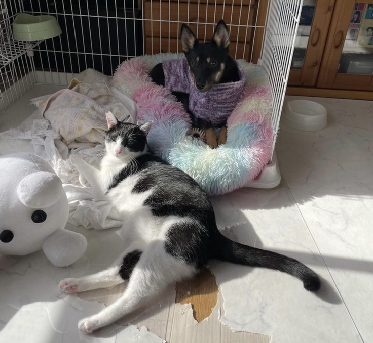 先輩猫さんたちとの距離も縮まってきたかな⁈お家の中もお散歩も、まだまだ怖いものもたくさんありますが、里親さんが、一歩一歩彼女のペースに合わせて寄り添ってくださり日々成長中!