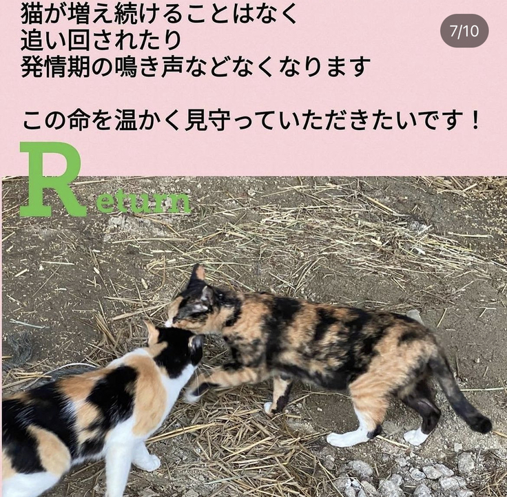 猫ちゃんは手術をして、元の場所へ戻すリターンができますが、犬は『狂犬病予防法』の問題があり、リターンができません。
