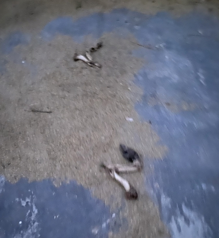 (2023/12/11に、この母犬の子4匹を保護しています。現場には、上の写真のように鹿肉や他にも動物の毛の束のようなものもあり、一生懸命育てていたのだと思われる。他にまだ取り残した子犬がいるのではないかと気になり、先月から何度か探しにも来ていた。そこに、今年に入り「子犬がいるよ」という情報をもらい、現在2匹の子犬の確認ができているので、保護しようと動いています。その様子は、1/31の活動報告に載せていますので、是非見てみてください。)