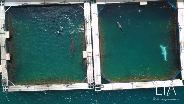 (↑私が行った日にドローンで撮影された写真。1日に100Kmくらい泳ぐイルカが12メートル四方の大きさのいけすに6頭くらい閉じ込められている。)