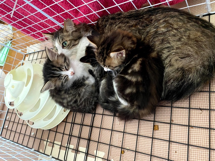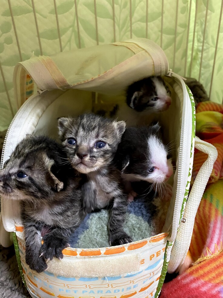 ケージに入れたとたん、赤ちゃんたちは母猫のもとに。