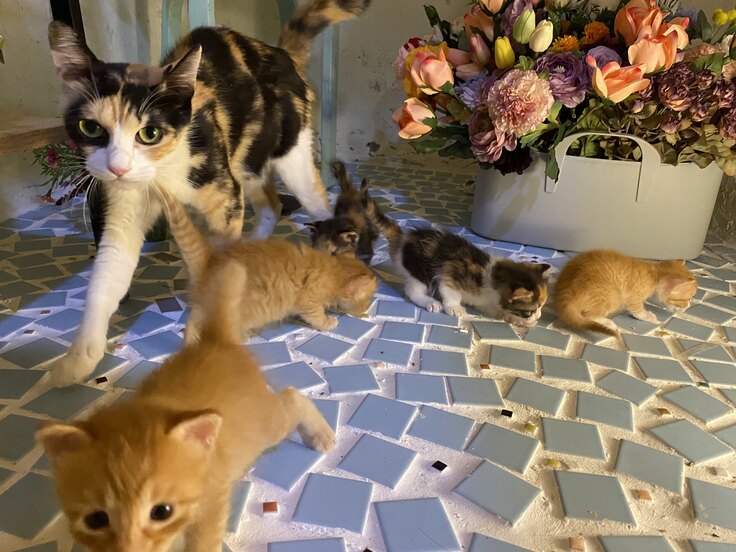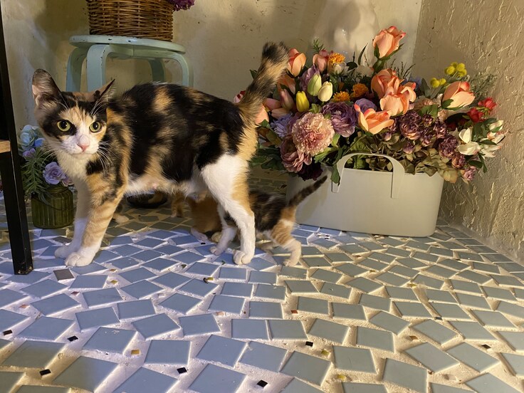 好奇心旺盛で、ちょろちょろする仔猫と、こちらを見つめるママ。