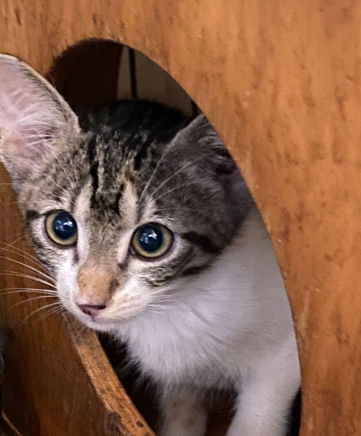 臆病で、母猫に守られて過ごし、弟や妹の後ろで様子を伺っていたこの子も、少しずつ他の猫とも触れ合えるようになり、やっと写真も可愛いい瞬間が撮影できるように。