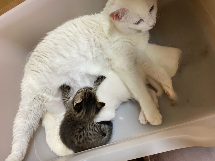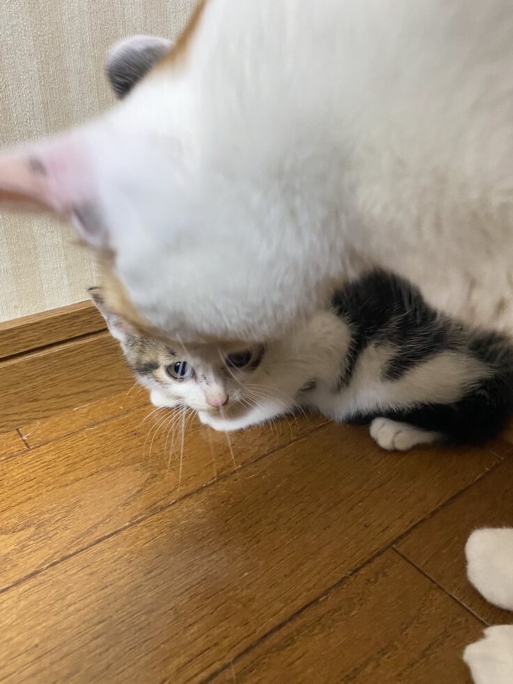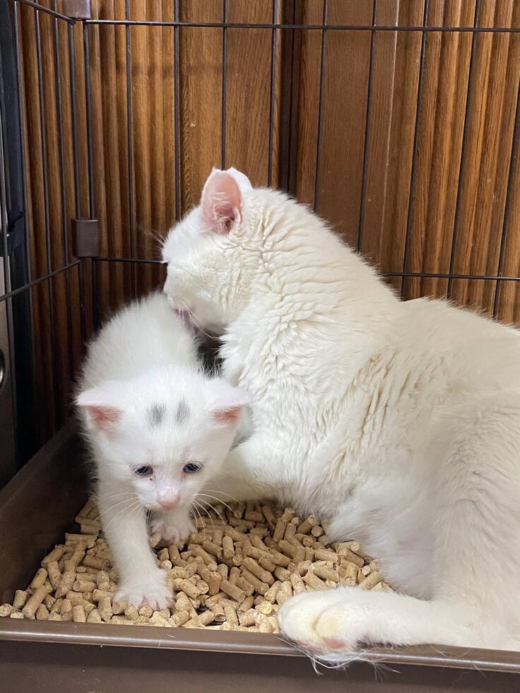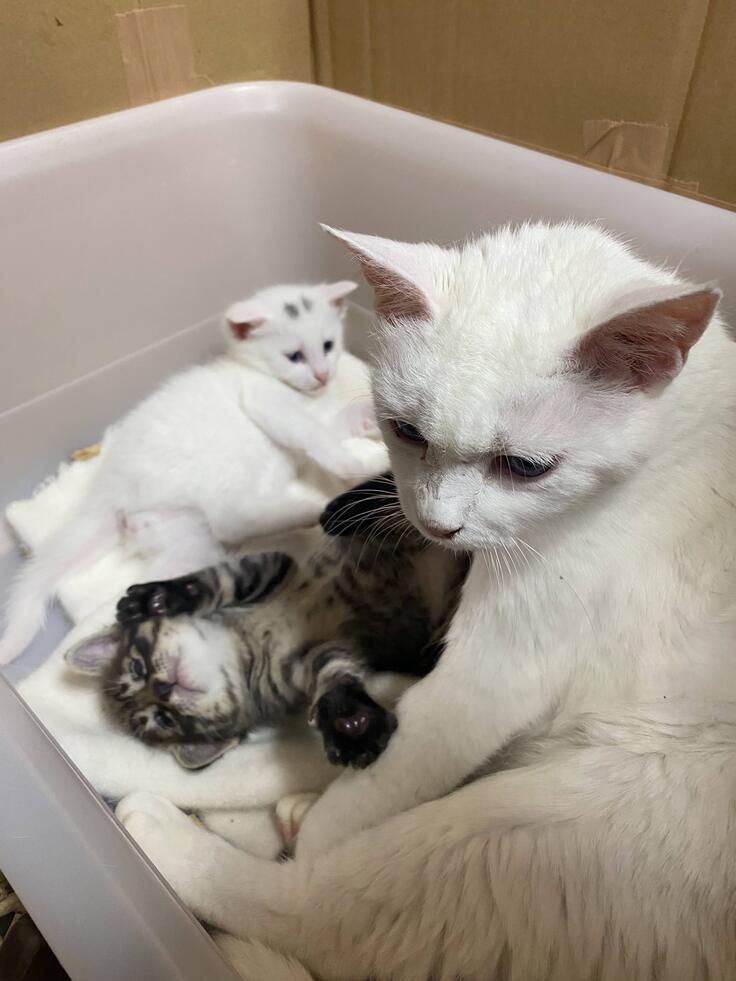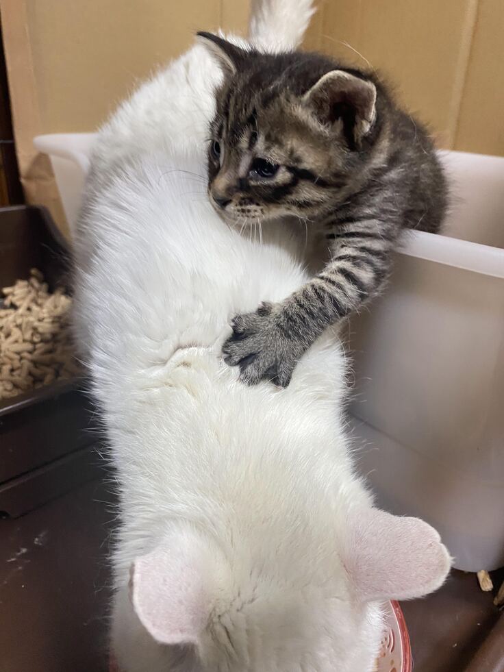 ママが恋しいだろうなと思うので、赤ちゃん猫や、母猫と一緒に保護された子猫に興味津々のこちらの猫がママ代理になってくれたらと思うのですが、