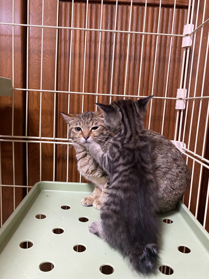 仔猫はすっかり慣れて、ケージからほかの猫にも平気で手を出していますけれど・・・・・