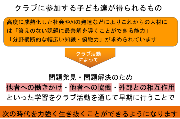 そこで、5人が考えだしたことが、地元の高校2つ、中学3つ、小学校6つの生徒や児童たちが、学年や学校の垣根を越えて、地元での活動を自分たちで企画して、自分たちで楽しみながら実行して、自分たちで学んでいく!そんなクラブを作ろうじゃないか!ということでした。