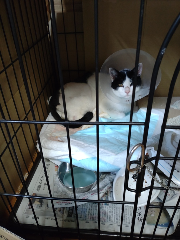 今日、術後経過と抜糸をしてもらいに病院へ行きます。知ってか知らずか…朝からゲージから出たがり、この有り様(^_^;)こんな事が出来るぐらい動けるようになりました(^^)