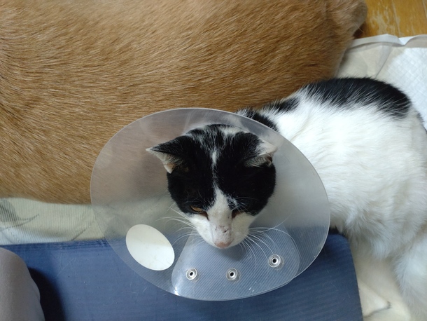 大型犬に見えますが、ちょっと丸太ん棒なだけです(^_^;)ネコちゃんは動じていませんが、犬の方はドキドキです(^^)安静期間中で、外に出すのを躊躇っていましたが、ゲージの中に居るより、短い時間ですが、そばにいる時は見守りながら出してあげていたほうが、大人しくしていてくれます(^^)