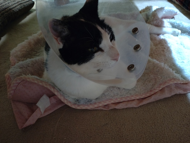 皆様にご支援頂きました支援金で、1/19に避妊手術を行い、1/20に退院して参りました。お陰様で手術は成功し、帰宅致しましたm(_ _)m久しぶりの外泊と、いつも側に居るはずの犬が居なかったからなのか、盛の時期だったのかはわかりませんが、病院のゲージの中で「出せ!!」コールをしていたようで、前脚の爪が剥がれてしまい痛々しい状態ですが、ご飯もしっかり食べ、おトイレもカラーに邪魔されながらもしっかりしています。