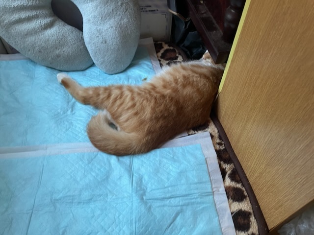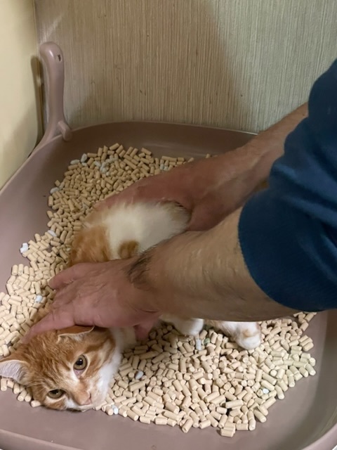 このままだとおしっこの出が悪く、放っておくと亡くなることもあるそうです。今は朝晩必ず手で出してあげています、癖がついたかどうかわからないが、おもらしを多くするようになりました。いいことだと思います。