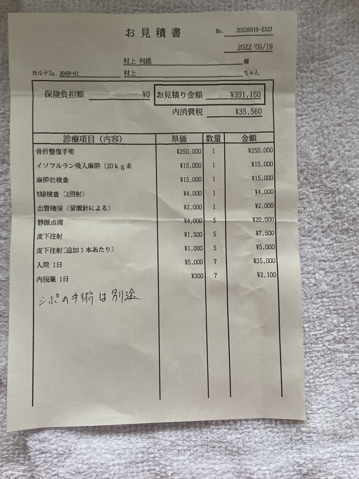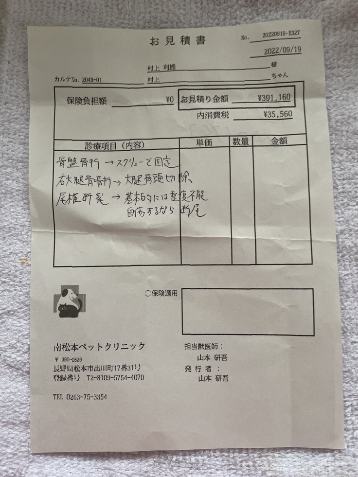 南松本ペットクリニックでも、骨盤骨折と片方の足大腿骨骨折していて当たらないように痛みを取るため削るそうです、また骨盤骨折が治ってからシッポを噛むようなら、しっぽの骨が離れているため、切断しないといけないと言われました。