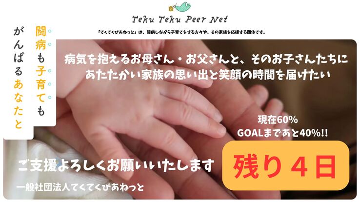 現在挑戦中のクラウドファンディング、「病気を抱えるお母さんとお父さんの子育てと暮らしの支援」に、たくさんのご支援と応援をいただき、心より感謝申し上げます。
