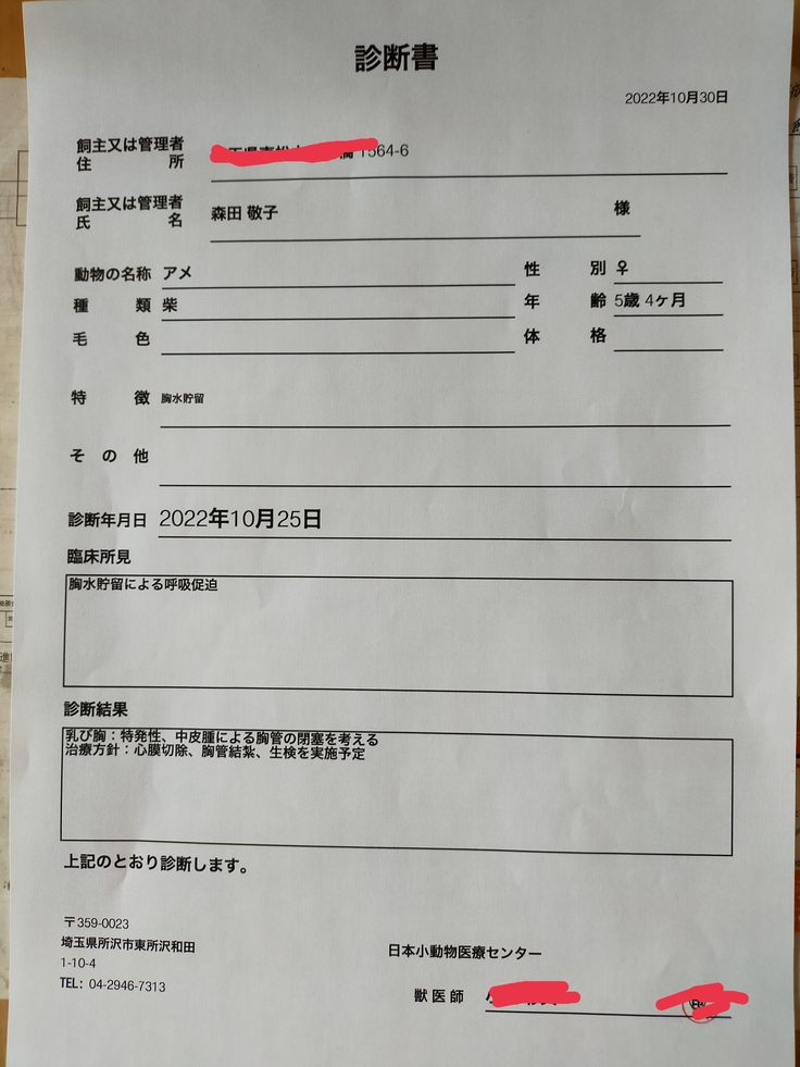 ネットで色々調べたところ、所沢に1か所、「乳び胸」手術ができる動物病院を見つけました。