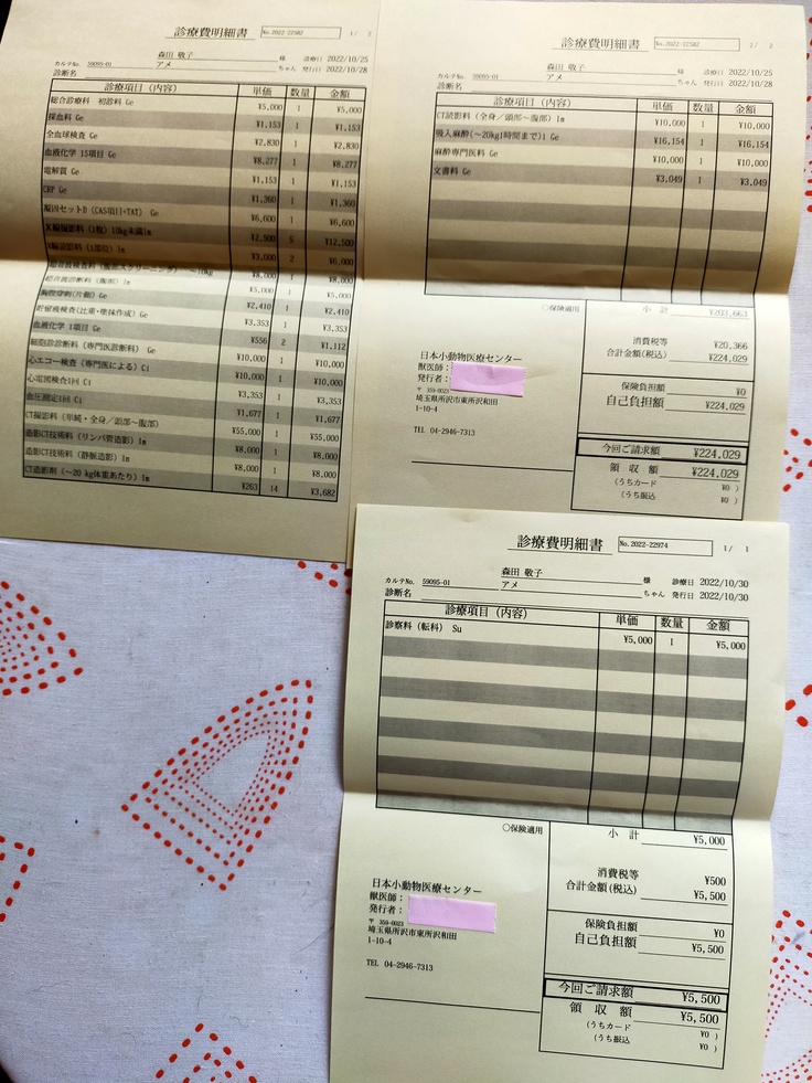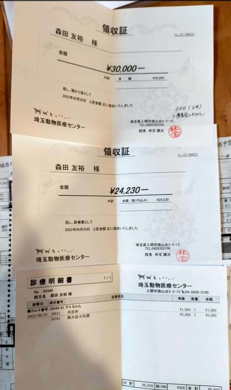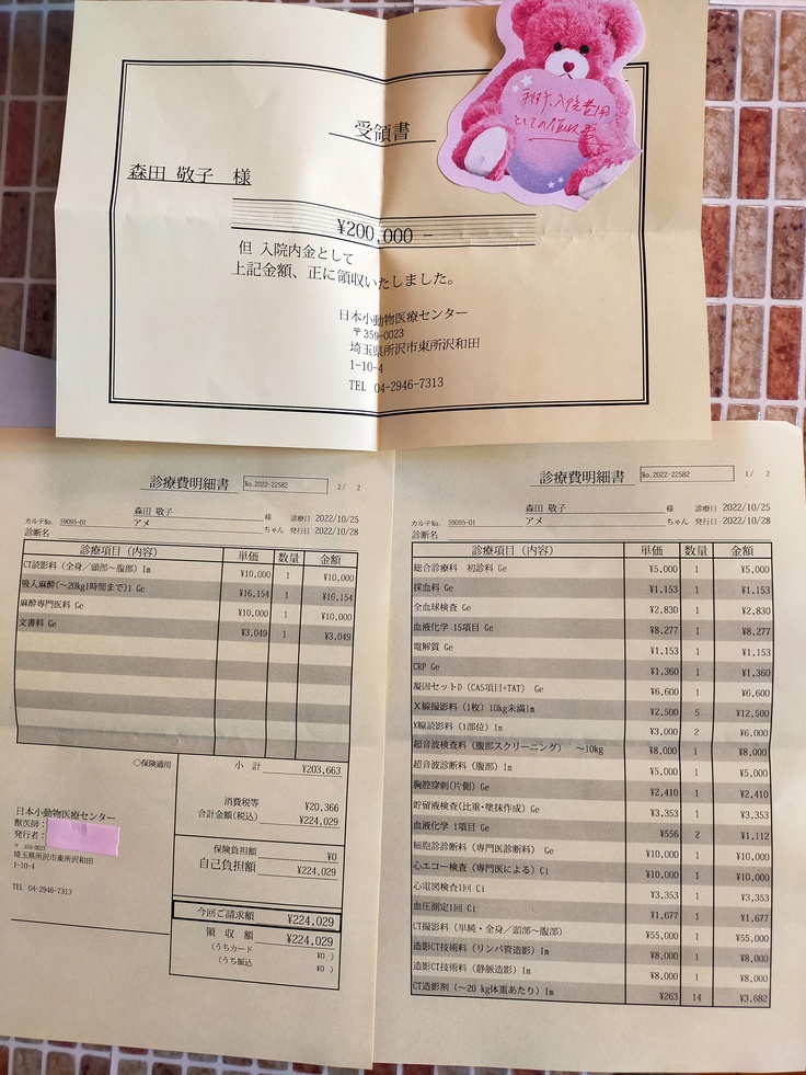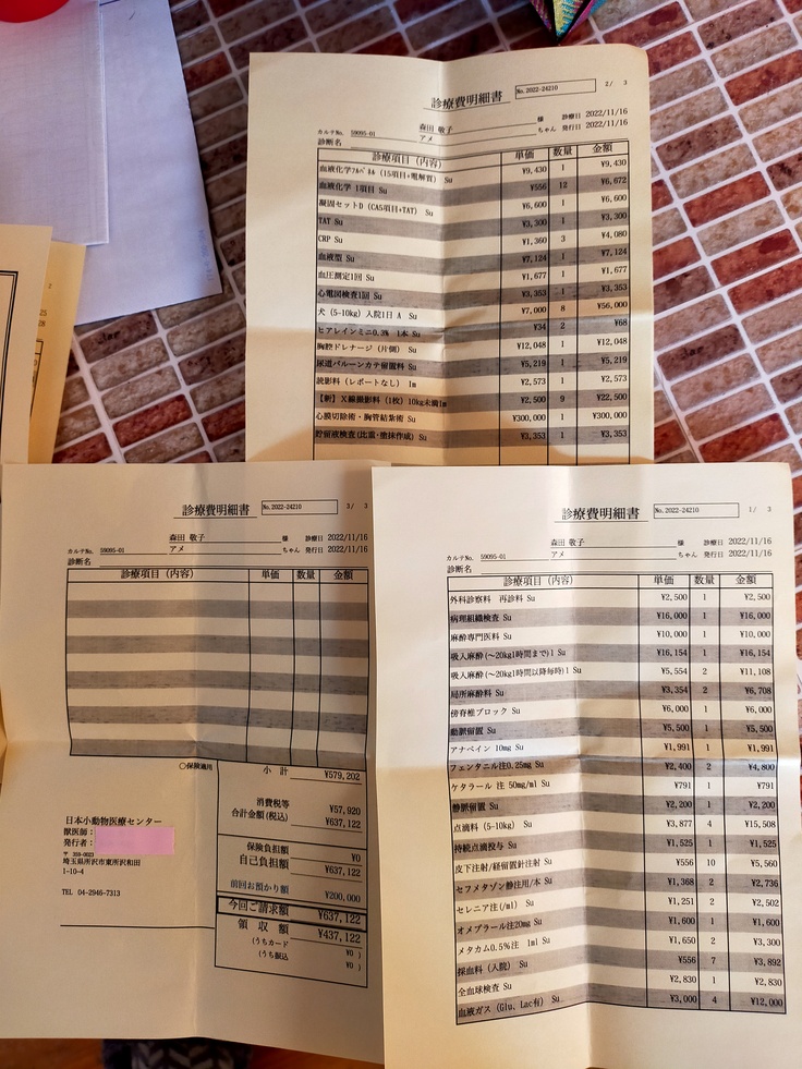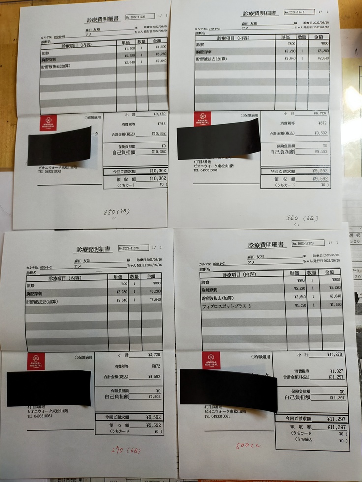遅くなりましたが、手術前検査、乳び胸手術、術後の検査費用等の明細書を掲載致します。
