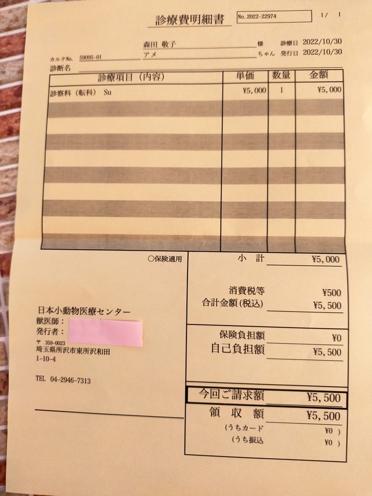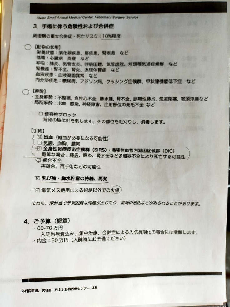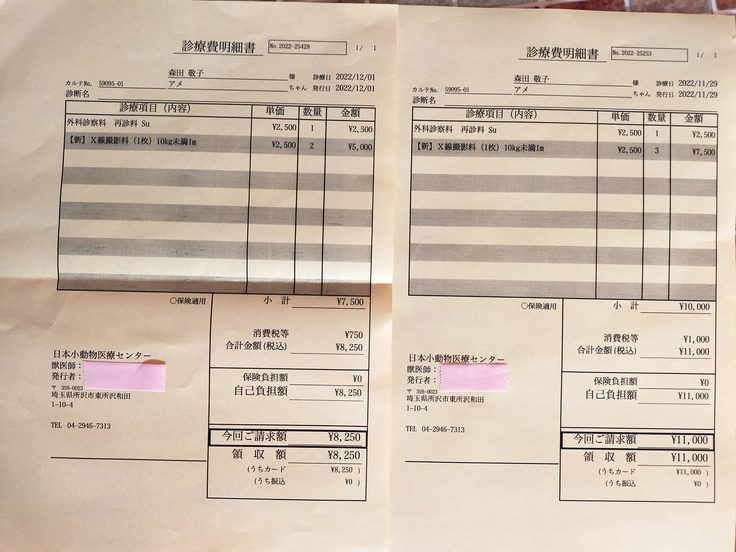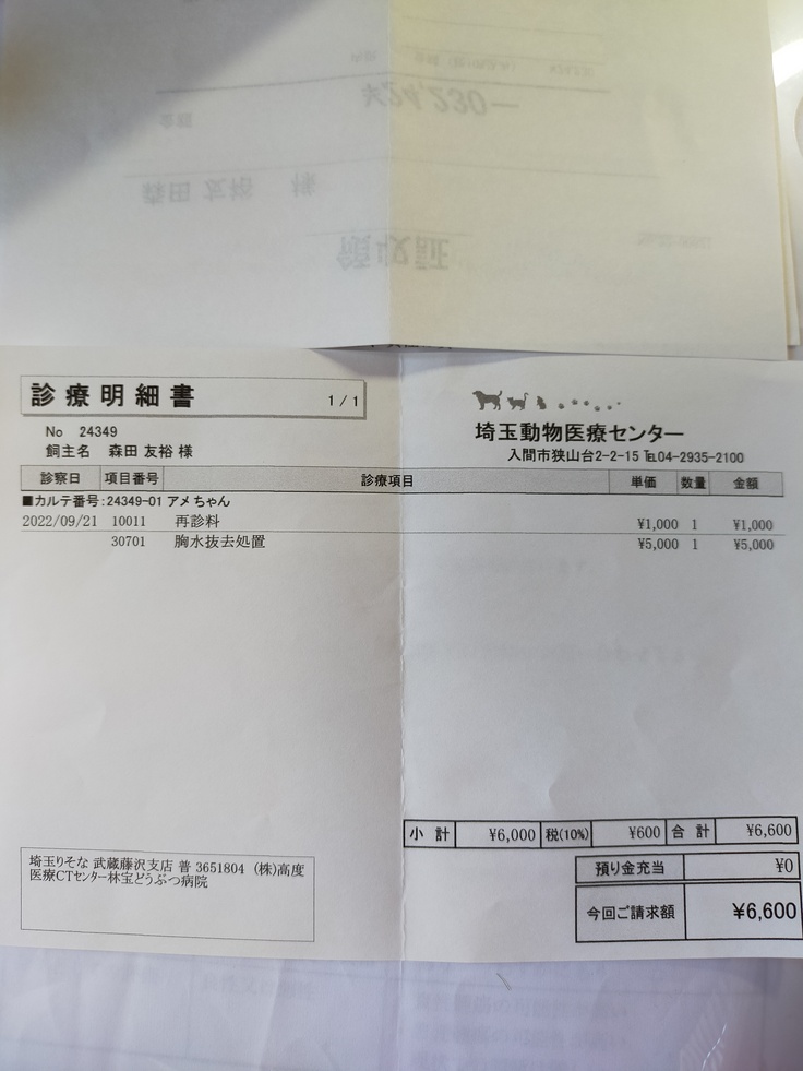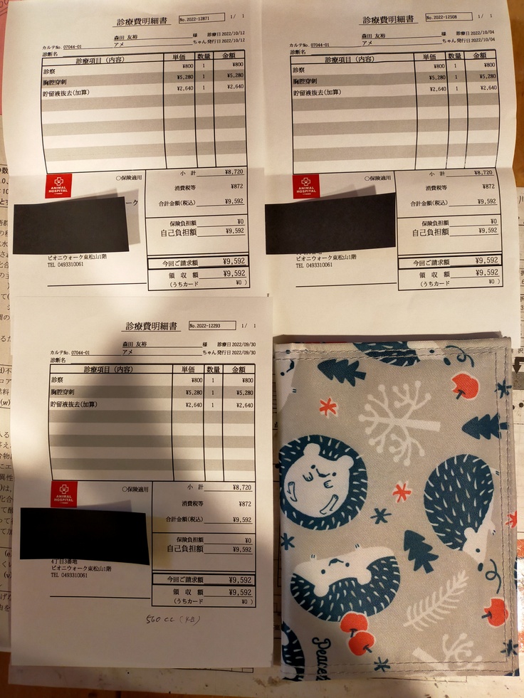 遅くなりましたが、手術前検査、乳び胸手術、術後の検査費用等の明細書を掲載致します。