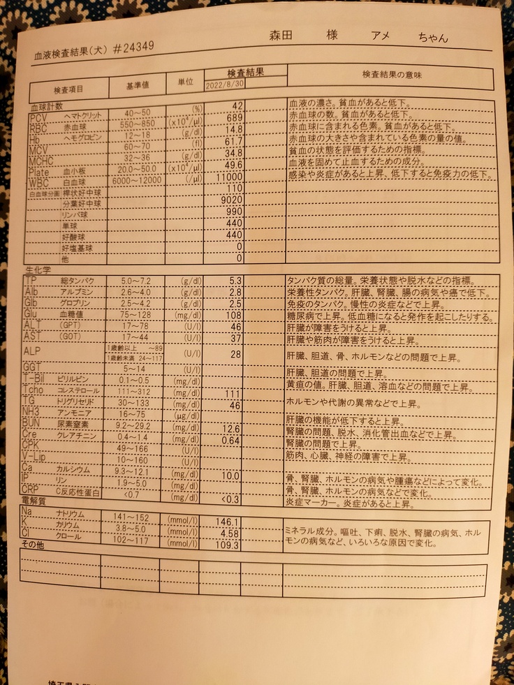 そして9/1、血液検査やCT検査、細菌検査等の再検査の結果、「乳び胸」であるとの診断を受けました。