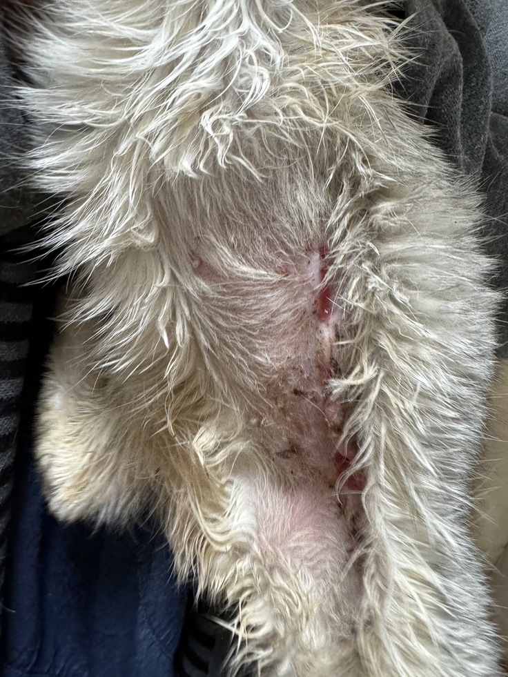 お腹の部分から後ろ足にかけて全摘出しないと治らないとのことでした。