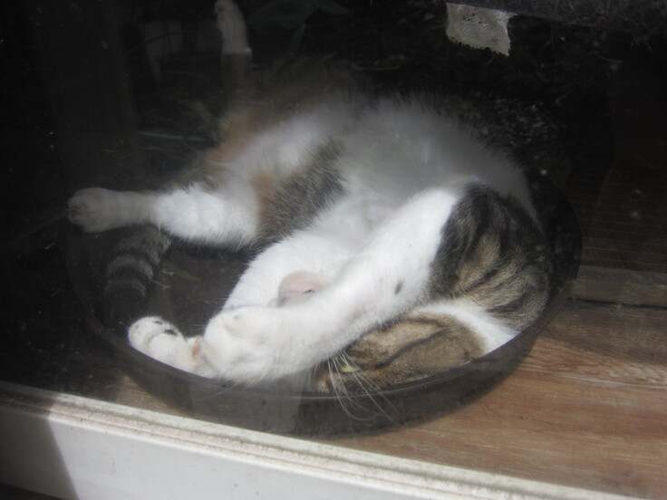(写真左・コタツと窓辺で爆睡中/右・タイソンくん)