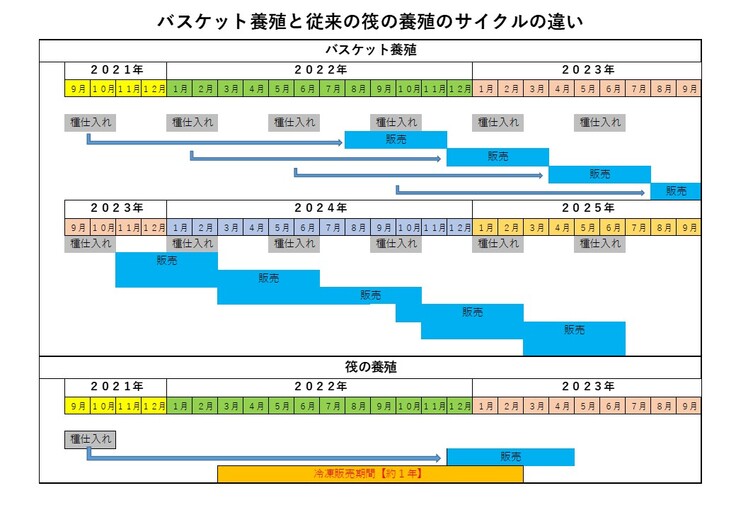 今までのいかだでの養殖と、バスケット養殖の生産サイクルの違いを表にしてみました。