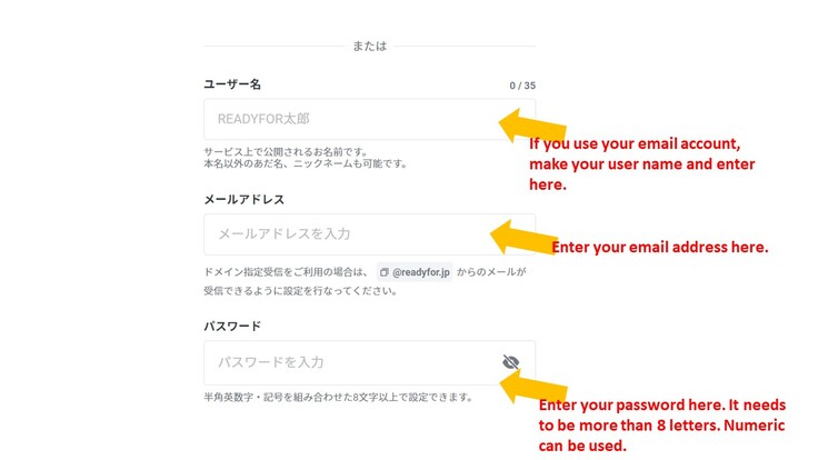 3. If you use your email account, please create your Readyfor user name, then enter your email account. You also need to create your password. The password needs to have more than 8 letters (you can use numeric and symbols too).