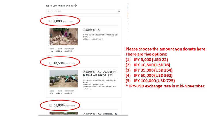 テント暮らしをする被災者に蚊帳を10個提供できる金額です。