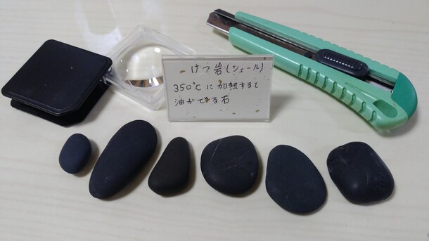 丸みを帯びたけつ岩と呼ばれる石です。シェールオイルのもとになる岩石で、350℃~550℃の熱で分解されます。一番右側の石は重さもつやもあり、この中で最もかたそうな石。左側の石はカッターで傷がつくので硬度5.5以下かと思われます。硬度はダイヤモンドが10で最大。サファイアは9。ひすいは8。メノウは7。一番やわらかい硬度1は滑石でチョークなどに使われています。秋田県男鹿市鵜ノ崎海岸はけつ岩のかたまりです。この層が地下に潜り込むと圧力と熱で石油になると考えられます。