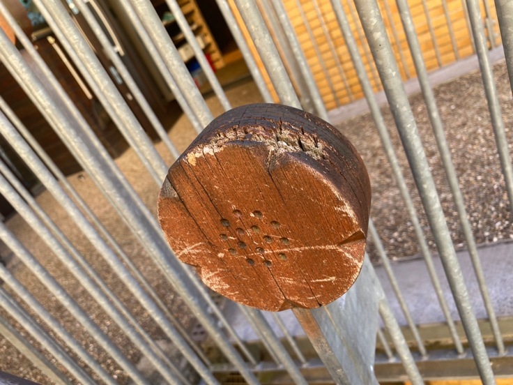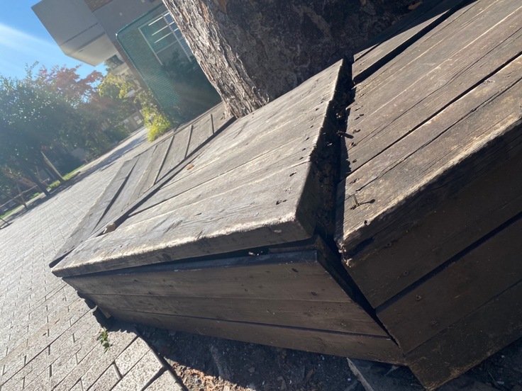 ベンチの凹凸だけでなく、釘が表面を突き出てしまい大変危険な状態です。