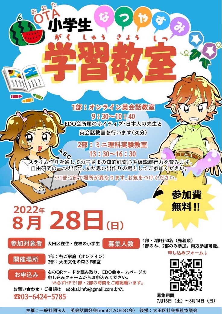 一般社団法人英会話同好会from OTA(略称:EDO会)は、大田区の社会貢献団体として英会話サロンをはじめ、主に子どもたちへの学習支援の活動をしています。(500円/ 1時間 小学生1時間、中学生2時間、週2回)