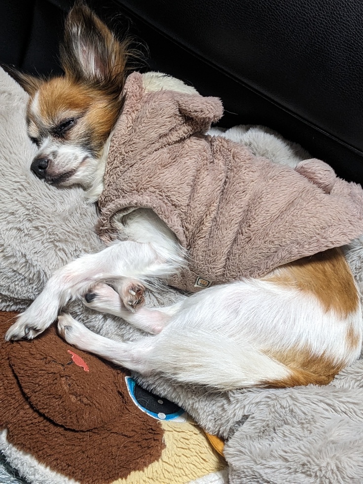 先週からの抗がん剤治療の注射の予定調和で間がいつもより空いたおかげか、散歩ではいつもより走り回りご飯も全部食べてくれて疲れて眠っています。