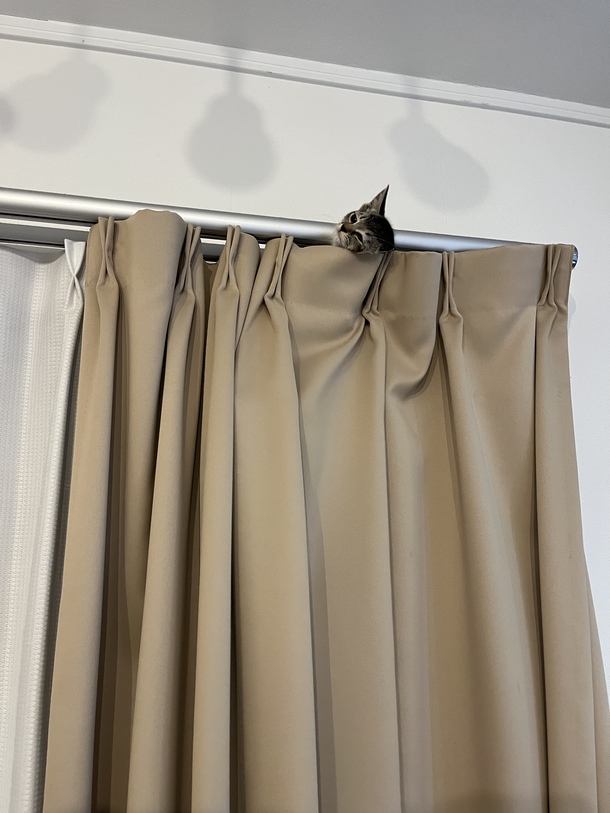 人間が怖くてキャリー出て一目散にカーテン這い上がっていったえまです。笑