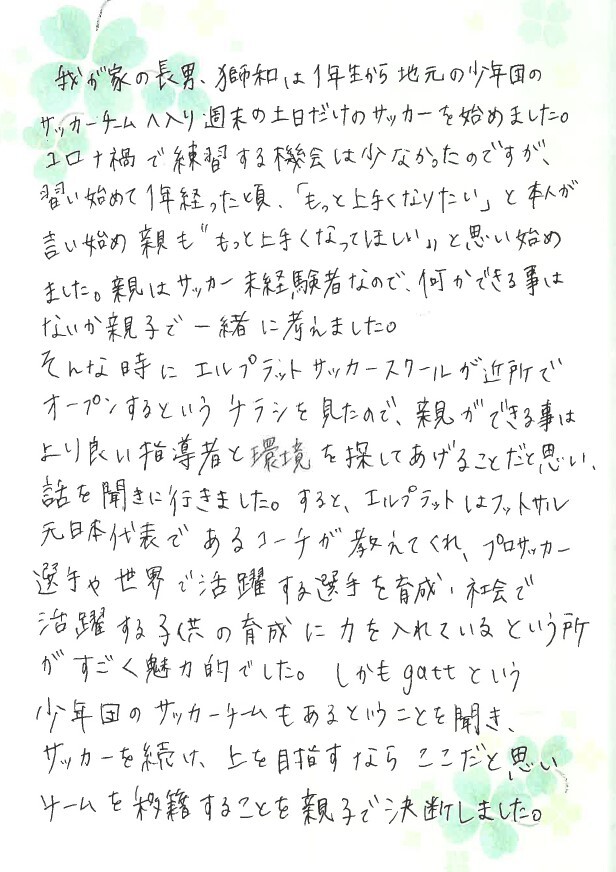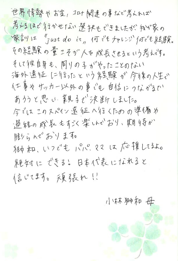 私たち親が子供たちに出来ることは彼らを信じ、愛情を基に支え続ける事と信じています。今回スペイン遠征に参加する小林さんが私たちを代表してスペインへの挑戦への想いを綴って下さりました。