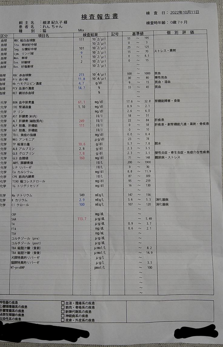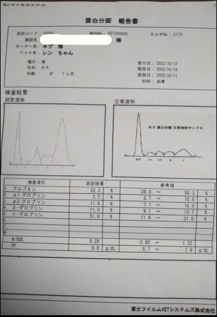これは絶対おかしいと思い、近くの病院へ連れていきました。病院での血液検査の結果では、あんと同じくFIPの可能性が高い、そして、エコーでは腎臓が腫れていて、貧血もある状態でした。