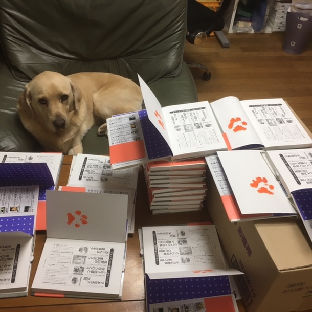 お礼状は実際にテントが届いて、お名前や応援メッセージをテントに書かせていただいた写真を撮ってからになります。ですので、リターンをお送りするのは先になってしまうのですが、お送りする本「こころの介助犬 天ちゃん」に伴走犬クレア(天ちゃんは亡くなっているので)の肉球をサインとして押印(笑)しました。