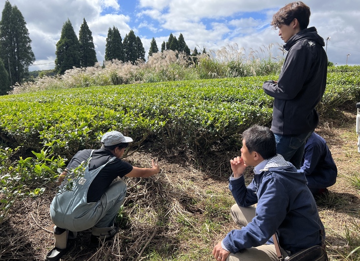 福岡県北九州市にある和紅茶のお店『tea bar horn』の店主である村上さんのご協力の元、令和4年10月には、現在の和紅茶を牽引されている熊本県の『天の製茶園』さん(茶葉の製造、紅茶の加工をされている)に視察をさせて頂き生産者の生の声を聞くことができました。同じ茶葉から揉捻(茶葉を揉む作業)の時間や強さ、発酵の具合、火入れの温度など様々な要因で茶葉の仕上がりが変わるということ。採取する茶の木の種類や、土壌、気候によって地域ごとの風味があることを学び、来年の収穫した茶葉を早く試してみたい!と良い刺激になりました。