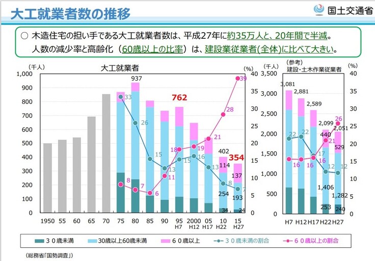 縦軸が大工さんの人数です。(出典) 国土交通省 大工就業者数の推移:https://www.mlit.go.jp/common/001371738.pdf