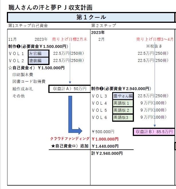 職人さんご家族を応援する絵本「絵ことば」はシリーズごと1000冊政策し500冊販売、500冊寄贈とします。 絵作成1作 お礼 30.000円 翻訳 3作 30.000円 コピー代など 30.000円 印刷製本(ハードカバー)代 1シリーズ約30p VOL1,左官屋編 1000冊 自己資金 VOL2,塗装屋さん編 1000冊 自己資金 VOL3,畳屋さん編 1000冊 750.000 VOL4,左官屋さん編 英訳版 1000冊 700.000円 VOL5,塗装屋さん編 英訳版 1000冊 700.000円 VOL6,畳屋さん編 英訳版 1000冊 700.000円