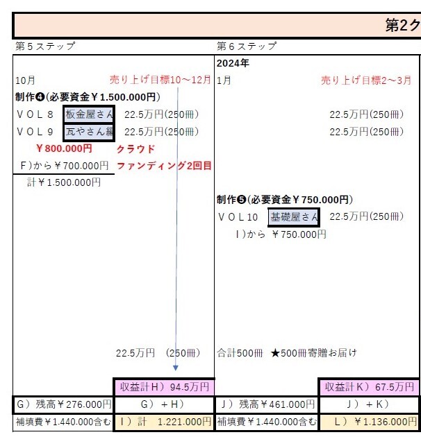 この計画では、ステップ5において2回目のクラウドファンディングを申請させていただくようになっていますが、まことに勝手な希望ですが今回の募集で多くの皆様のご支援を頂き、2回目までの目標金額を超えることが出来れば、今回の募集で第2クールも進められると考えています。