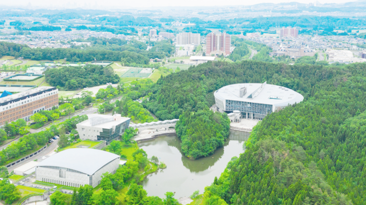 【キャンパス】20haの敷地全体はもともとコナラやカエデなどの雑木林で、炭や薪をとっていた歴史もありました。60年前にスギやヒノキ、マツが植林されました。今から27年前の1996年に、この森の中に宮城大学が建設、開設され、敷地の約半分が校舎、運動場、駐車場、人工池などになり、それ以外の区域が森林のまま残されました。森林内には階段、散策道もあり、一部の歩道は南にある宮城県立図書館の敷地につながっています。このキャンパスは、奥羽山脈からの山のつらなりが、仙台市北部泉区や大和町の住宅地や工業団地、メガソーラー基地が作られていく地域に伸びるように残された森で、市街地の最前線に位置しています。