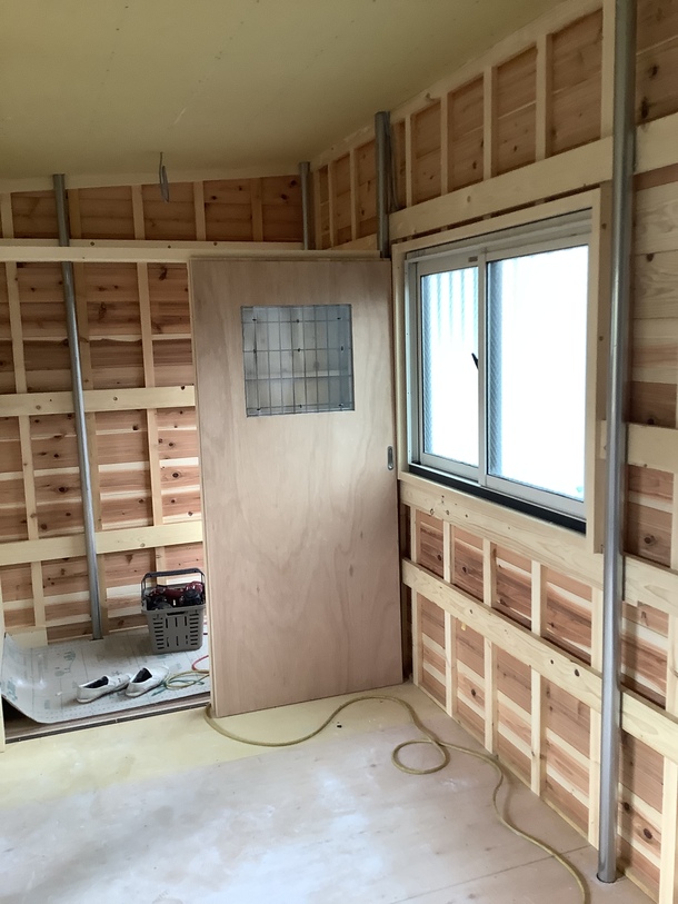 周りがふさがりました、後は、電気工事と、床貼り 外回りのペンキ塗りをやります。後一歩