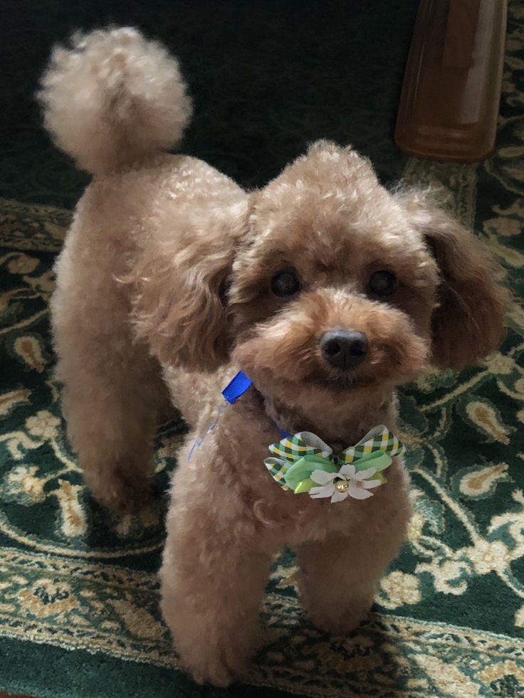 ペットショップで見かけた時には、10匹以上いる子達の中では小さい方で、自分より3倍は大きなぬいぐるみを他の子達に取られないようにくわえて走り回り、そして誰にも取られる事なく逃げ回っている活発で俊敏な子でした。