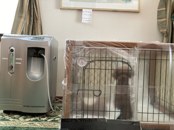 「肺水腫」は酸素室に入れての治療となる為、受信した日と次の日は入院となりました。自宅では退院までに酸素機をレンタルして、その中で様子を見る環境を整えて…クリアファイルやビニールシート等で手作りの密閉したゲージとレンタル酸素機で酸素室を用意しました。この中では呼吸が楽になります。