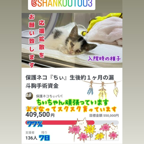 ちぃと応援頂いている皆様とクラウドファンディングを成功させる事で今後救われる命の為に最後まで諦めずに頑張ります。